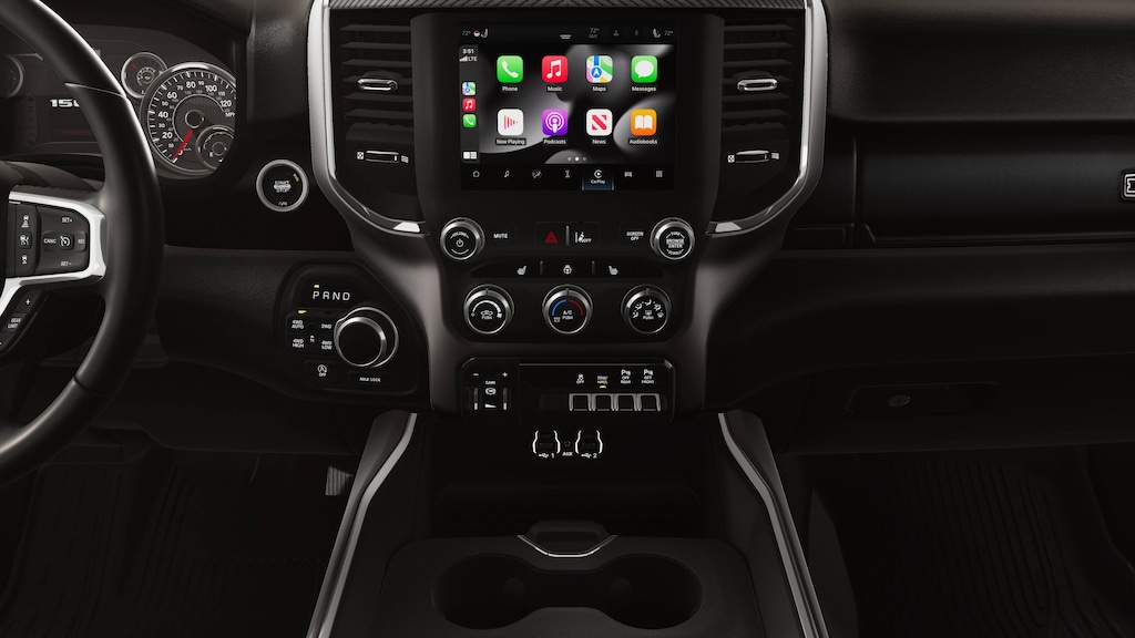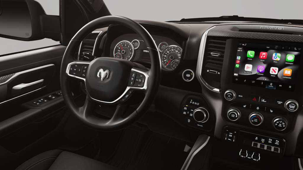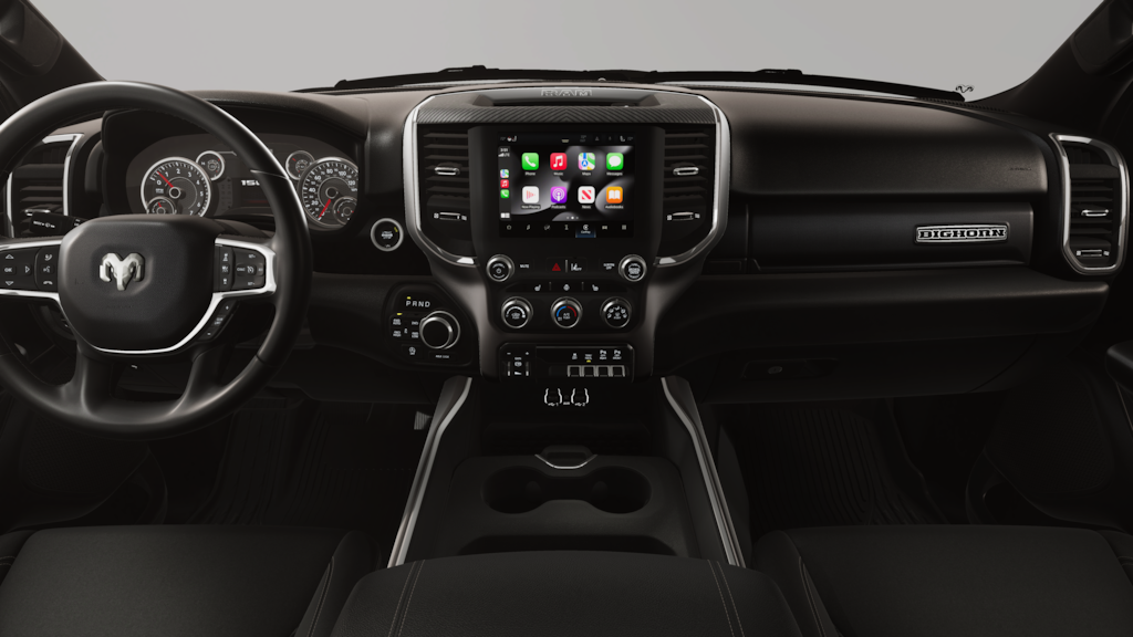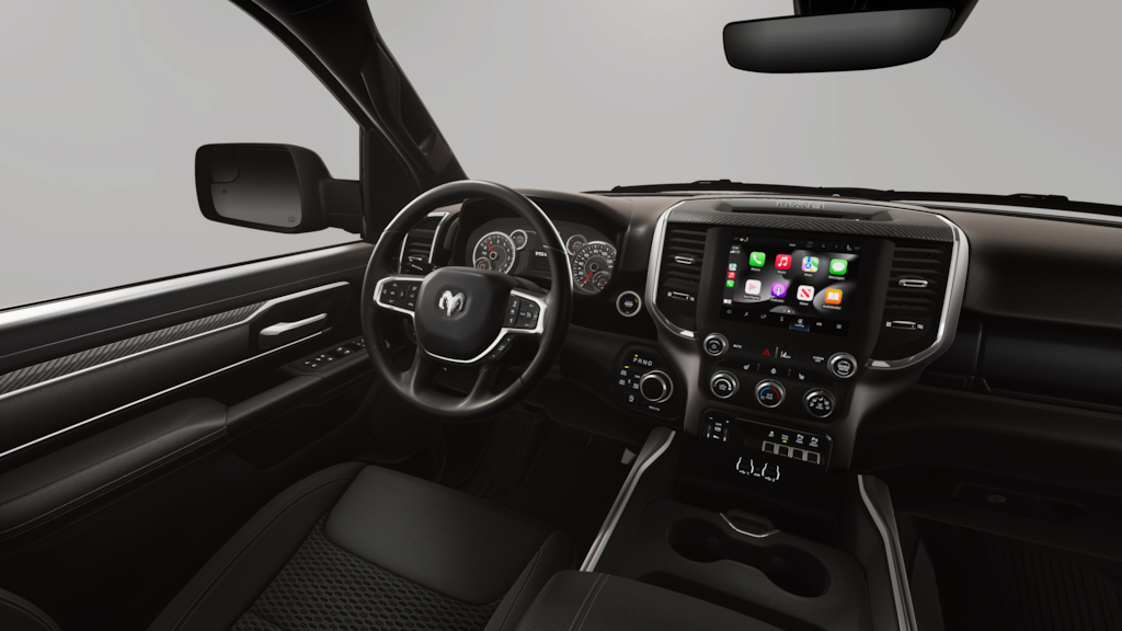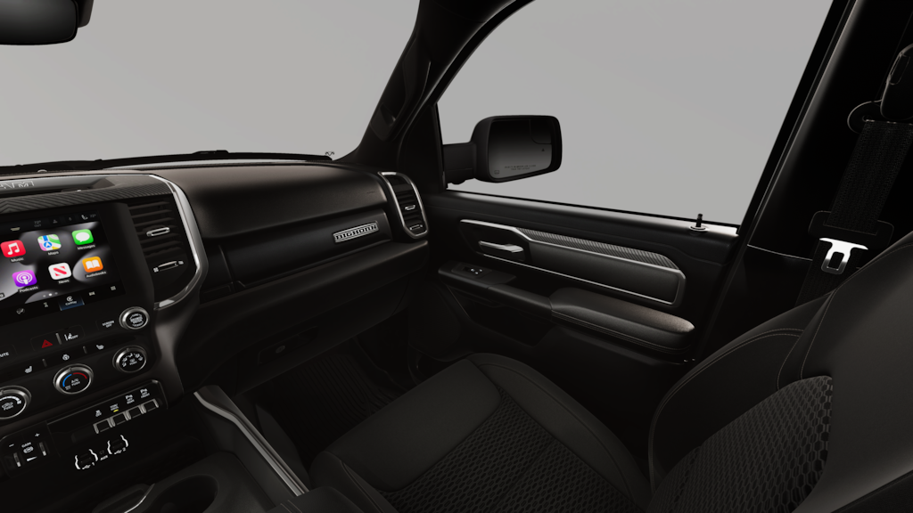 BIG HORN LEVEL 1 EQUIPMENT GROUP SiriusXM Radio Service, Rear Window Defroster, Rear View Auto Dim Mirror, Power Adjustable Pedals, Leather Wrapped Steering Wheel, Rear Power Sliding Window, Rear Dome w/On/Off Switch Lamp, Glove Box Lamp, Auto Power-Folding Mirrors, Auto Dim Exterior Driver Mirror, Heated Front Seats, Heated Steering Wheel, Black Premium Power Mirrors, SiriusXM Satellite Radio, 400W Inverter, Secondary Active Grille Shutters, Exterior Mirrors w/Supplemental Signals, Steering Wheel Mounted Audio Controls, Exterior Mirrors Courtesy Lamps, Body Color Fender Flares, 115V Auxiliary Power Outlet, Universal Garage Door Opener, 2nd Row In Floor Storage Bins, Sun Visors w/Illuminated Vanity Mirrors, WHEELS: 20 X 9 ALUMINUM CHROME CLAD (WRK) Tires: 275/55R20 OWL All Season, Bridgestone Brand Tires, BED UTILITY GROUP MOPAR Spray In Bedliner, MOPAR 4 Adjustable Cargo Tie-Down Hooks, Pick-Up Box Lighting, Exterior 115V AC Outlet, PROTECTION GROUP Transfer Case Skid Plate, Steering Gear Skid Plate, Fuel Tank Skid Plate, Tow Hooks, MOPAR FRONT & REAR RUBBER FLOOR MATS, TRANSMISSION: 8-SPEED AUTOMATIC (8HP75), E-LOCKER REAR AXLE, ENGINE: 5.7L V8 HEMI MDS VVT ETORQUE Active Noise Control System, Heavy Duty Engine Cooling, Passive Tuned Mass Damper, GVWR: 7,100 lbs, Dual Rear Exhaust w/Bright Tips, G/T Exhaust, 18 Aluminum Spare Wheel, 33 Gallon Fuel Tank. Ram Big Horn with Diamond Black Crystal Pearlcoat exterior and Black interior features a 8 Cylinder Engine with 305 HP at 6400 RPM*.