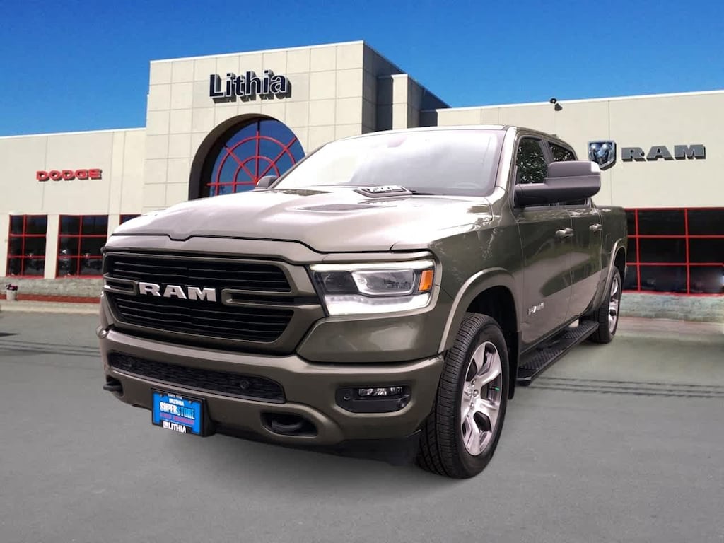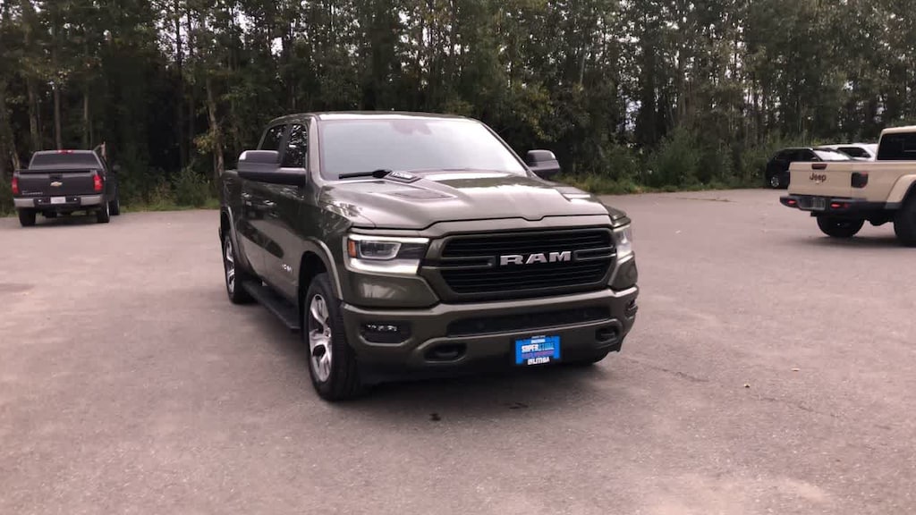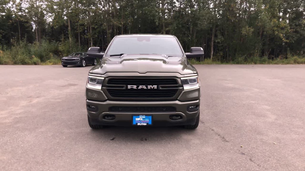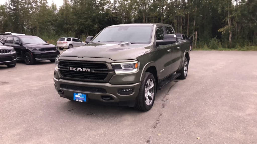 LARAMIE LEVEL B EQUIPMENT GROUP Remote Tailgate Release, harman/kardon® 19 Speaker Premium Sound, Rear Underseat Compartment Storage, Auto High Beam Headlamp Control, Rain Sensitive Windshield Wipers, Heated Second Row Seats, ParkSense Front/Rear Park Assist w/Stop, Tailgate Ajar Warning Lamp, Foam Bottle Insert (Door Trim Panel), Radio: Uconnect 4C Nav w/8.4 Display, Rear 60/40 Folding Split Recline Seat, SPORT APPEARANCE PACKAGE Tires: 275/55R20 OWL All Season, Body Color Exterior Mirrors, Black Interior Accents, Body Color Premium Power Mirrors, Sport Performance Hood, Body Color Front Bumper, Sport Decal, Body Color Door Handles, Body Color Rear Bumper w/Step Pads, Wheels: 20 x 9 Premium Painted w/Inserts, Grille Surround 3 Body Color Tex 2 Black, ENGINE: 5.7L V8 HEMI MDS VVT ETORQUE Active Noise Control System, Heavy Duty Engine Cooling, GVWR: 7,100 lbs, Dual Rear Exhaust w/Bright Tips, HEMI Badge, 23 Gallon Fuel Tank, 18 Aluminum Spare Wheel, DUAL-PANE PANORAMIC SUNROOF LED Dome/Reading Lamp, Dome Dual LED Reading Lamp, RADIO: UCONNECT 12 W/NAVIGATION SiriusXM Traffic Plus, USB Host Flip, Disassociated Touchscreen Display, HD Radio, For Details, Visit DriveUconnect.com, 1-Yr SiriusXM Guardian Trial, 12 Touchscreen Display, GPS Navigation, SiriusXM Travel Link, 4G LTE Wi-Fi Hot Spot, SiriusXM w/360L, BLACK, LEATHER TRIMMED BUCKET SEATS Bucket Seats, Center Console Parts Module, Full Length Upgraded Floor Console, ANTI-SPIN DIFFERENTIAL REAR AXLE, BLACK POWER-FOLD TRAILER TOW MIRRORS Exterior Mirrors w/Heating Element, Mirror-Mounted Aux Reverse Lamps, Exterior Mirrors w/Memory, Mirror Clearance/Running Lights, Exterior Mirrors w/Supplemental Signals, Power-Folding Mirrors, Black Exterior Mirrors, Exterior Mirrors Courtesy Lamps, Trailer Tow Mirrors, PROTECTION GROUP Transfer Case Skid Plate, Steering Gear Skid Plate, Front Suspension Skid Plate, Fuel Tank Skid Plate, Tow Hooks, TRANSMISSION: 8-SPEED AUTOMATIC (8HP75). Ram Laramie with Olive Green Pearlcoat exterior and Black interior features a 8 Cylinder Engine with 305 HP at 6400 RPM*.