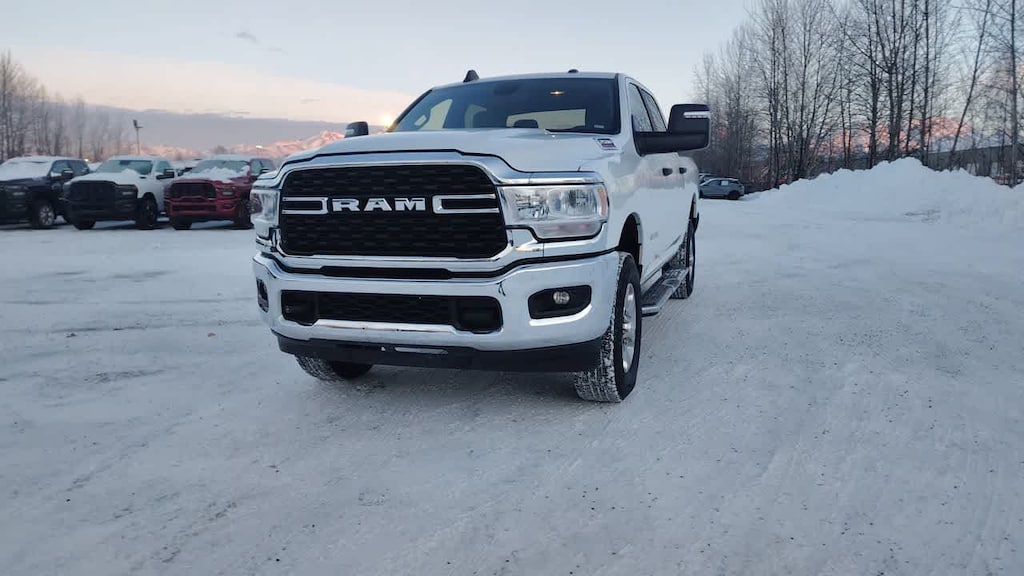DIESEL GRAY/BLACK, PREMIUM CLOTH 40/20/40 BENCH SEAT Storage Tray, Rear 60/40 Folding Seat, Front Armrest w/Cupholders, Remote USB Port - Charge Only, Front Center Seat Cushion Storage, Manual Adjust 4-Way Front Passenger Seat, Power Adjust 8-Way Driver Seat, Front Seat Back Map Pockets, Power 2-Way Driver Lumbar Adjust, CHROME FLAT CAB-LENGTH SIDE STEPS, LEVEL 1 EQUIPMENT GROUP Google Android Auto®, For Details, Visit DriveUconnect.com, For More Info, Call 800-643-2112, Leather Wrapped Steering Wheel, Rear Dome w/On/Off Switch Lamp, Front Fog Lamps, Glove Box Lamp, Auto Power-Folding Mirrors, Footwell Courtesy Lamp, 4G LTE Wi-Fi Hot Spot, Mirror Running Lights, Radio: Uconnect 5 W w/8.4 Display, 8.4 Touchscreen Display, Foam Bottle Insert (Door Trim Panel), Wheels: 18 x 8.0 Polished Aluminum, Apple CarPlay®, Big Horn IP Badge, Power Adjustable Convex Aux Mirrors, Forward & Reverse Utility Lights, Locking Lower Glove Box, Selectable Tire Fill Alert, SiriusXM Satellite Radio, Power Heated Fold Telescope Mirrors, Exterior Mirrors w/Supplemental Signals, Steering Wheel Mounted Audio Controls, Exterior Mirrors Courtesy Lamps, Dual Glove, TRANSMISSION: 8-SPEED AUTO (8HP75-LCV) (STD), ENGINE: 6.4L V8 HEAVY DUTY HEMI MDS (STD). Ram Big Horn with Bright White Clearcoat exterior and Diesel Gray/Black interior features a 8 Cylinder Engine with 410 HP at 5600 RPM*.