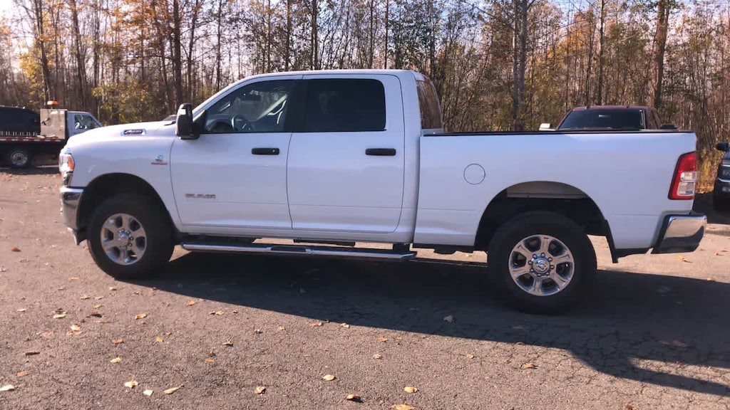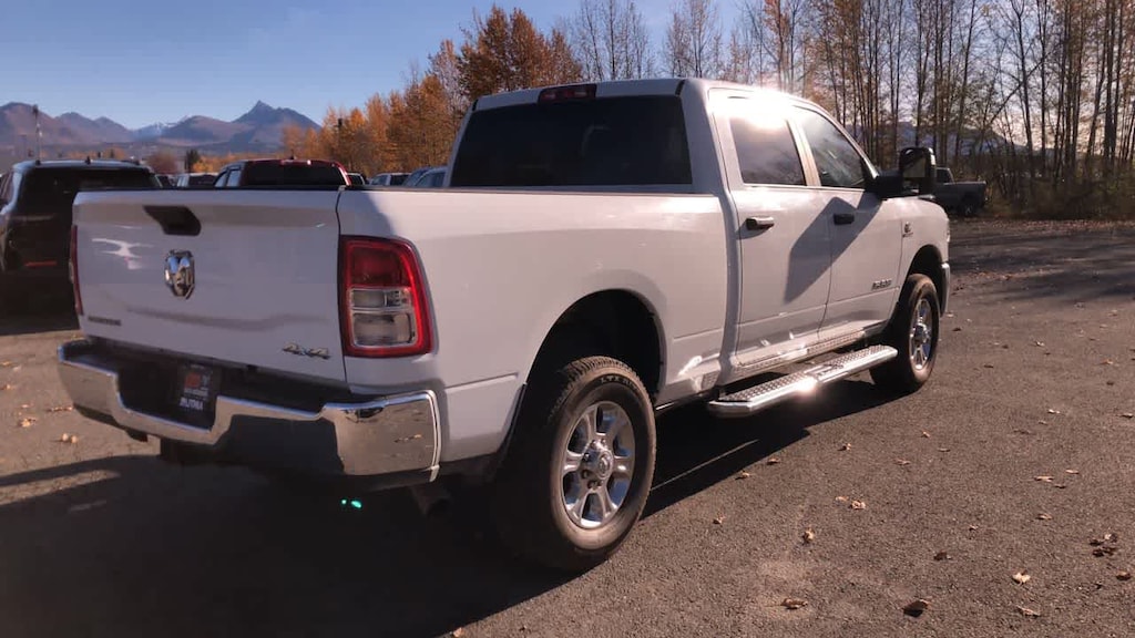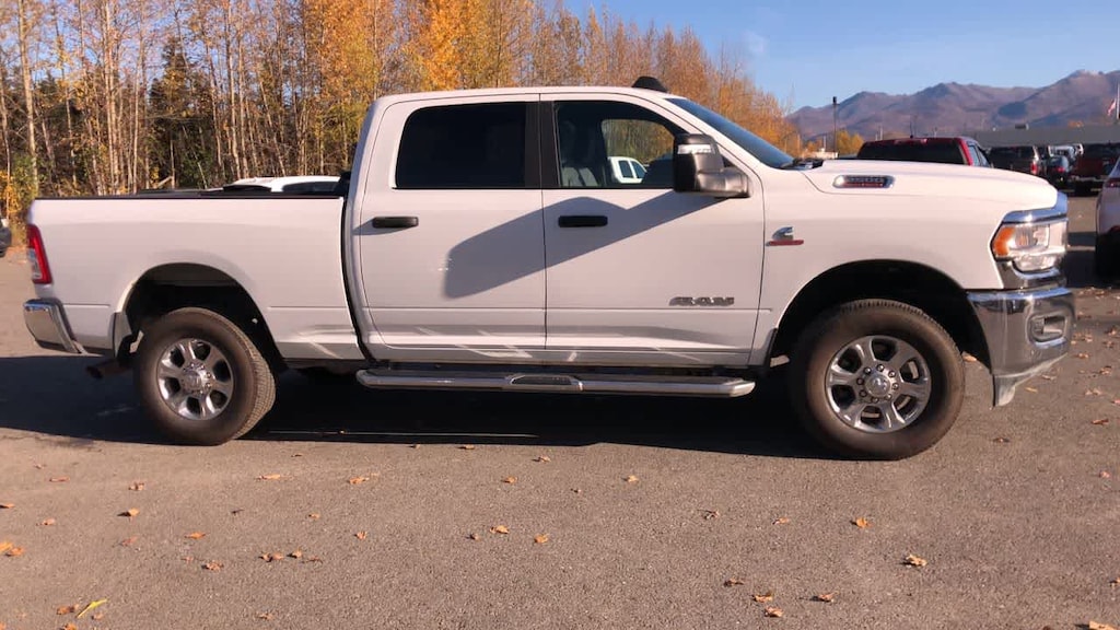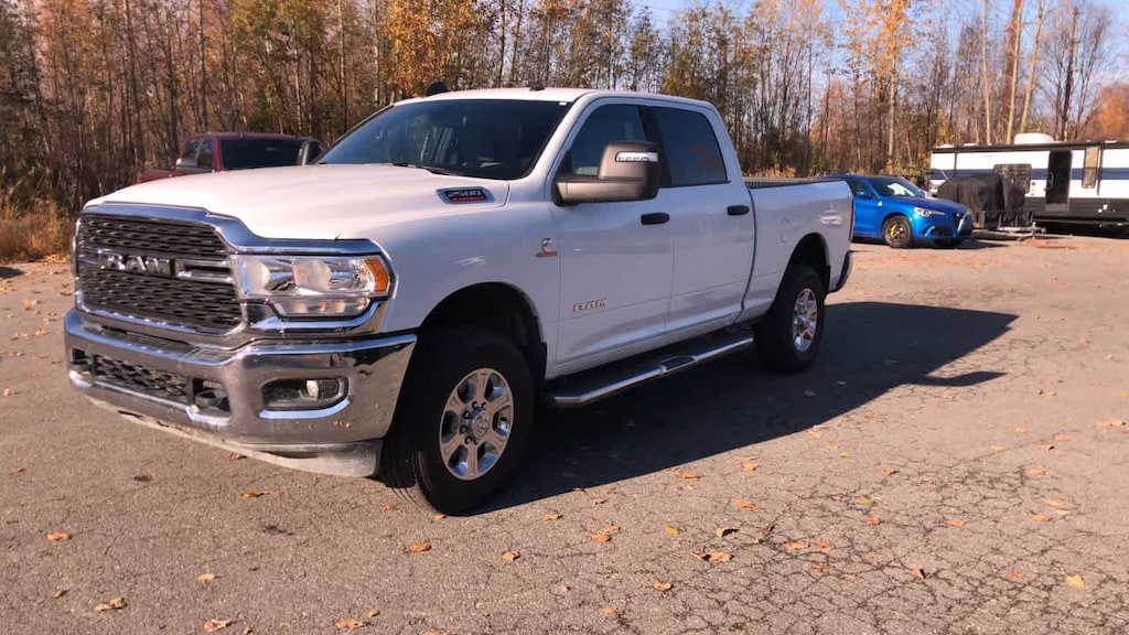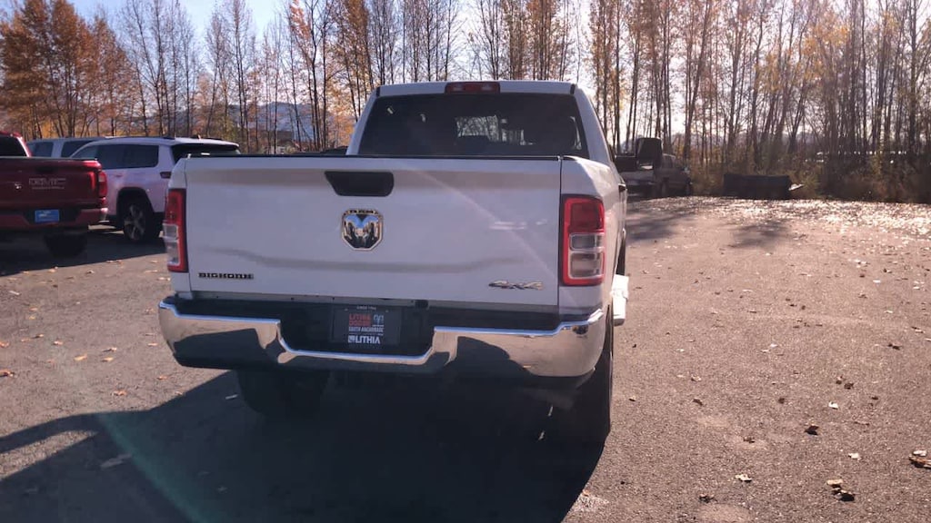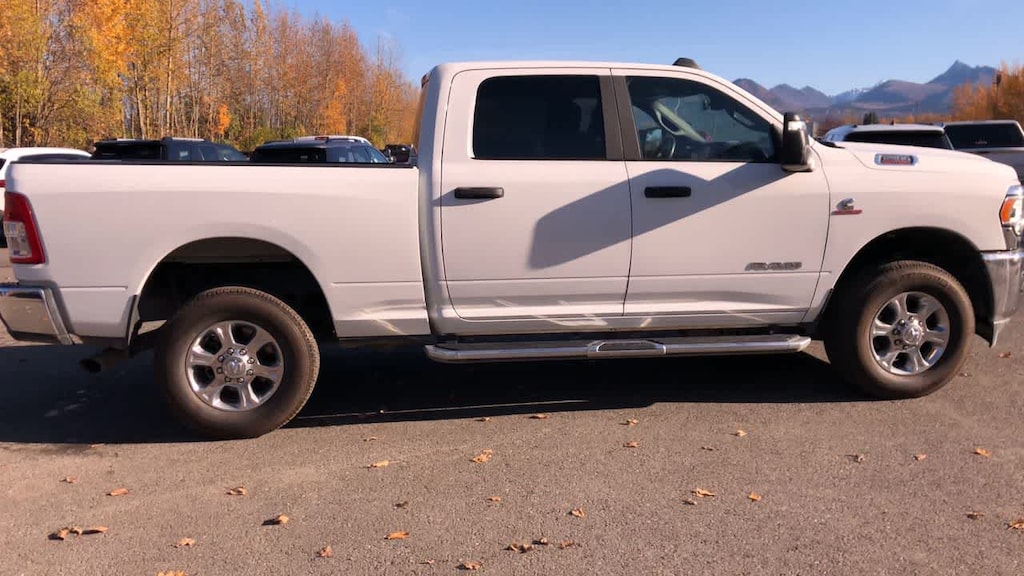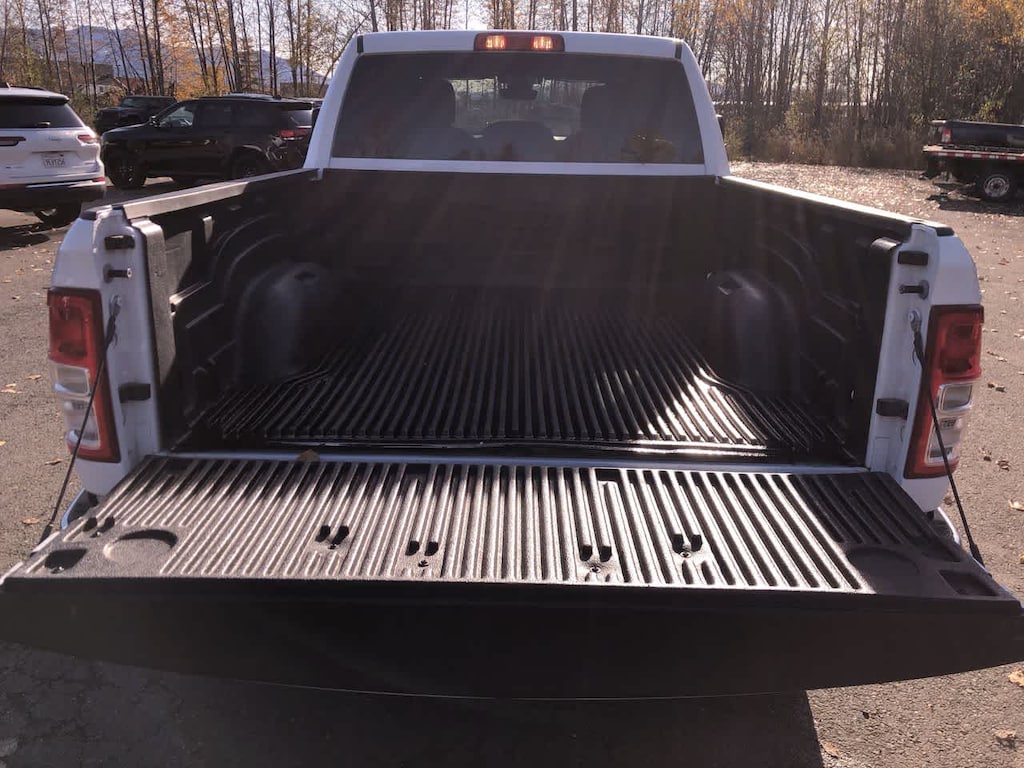 ENGINE: 6.7L I6 CUMMINS TURBO DIESEL Selective Catalytic Reduction (Urea), Dual 730 Amp Maintenance Free Batteries, Cummins Turbo Diesel Badge, Heavy Duty Engine Cooling, Tow Hooks, Diesel Exhaust Brake, Supplemental Heater, Front Bumper Sight Shields, Capless Fuel Fill w/o Discriminator, DIESEL GRAY/BLACK, PREMIUM CLOTH 40/20/40 BENCH SEAT Storage Tray, Rear 60/40 Folding Seat, Front Armrest w/Cupholders, Remote USB Port - Charge Only, Front Center Seat Cushion Storage, Manual Adjust 4-Way Front Passenger Seat, Power Adjust 8-Way Driver Seat, Front Seat Back Map Pockets, Power 2-Way Driver Lumbar Adjust, CHROME FLAT CAB-LENGTH SIDE STEPS, LEVEL 1 EQUIPMENT GROUP Google Android Auto®, For Details, Visit DriveUconnect.com, For More Info, Call 800-643-2112, Leather Wrapped Steering Wheel, Rear Dome w/On/Off Switch Lamp, Front Fog Lamps, Glove Box Lamp, Auto Power-Folding Mirrors, Footwell Courtesy Lamp, 4G LTE Wi-Fi Hot Spot, Mirror Running Lights, Radio: Uconnect 5 W w/8.4 Display, 8.4 Touchscreen Display, Foam Bottle Insert (Door Trim Panel), Wheels: 18 x 8.0 Polished Aluminum, Apple CarPlay®, Big Horn IP Badge, Power Adjustable Convex Aux Mirrors, Forward & Reverse Utility Lights, Locking Lower Glove Box, Selectable Tire Fill Alert, SiriusXM Satellite Radio, Power Heated Fold Telescope Mirrors, Exterior Mirrors w/Supplemental Signals, Steering Wheel Mounted Audio Controls, Exterior Mirrors Courtesy Lamps, Dual Glove, TRANSMISSION: 6-SPEED AUTOMATIC (68RFE). Ram Big Horn with Bright White Clearcoat exterior and Diesel Gray/Black interior features a Straight 6 Cylinder Engine with 410 HP at 5600 RPM*.